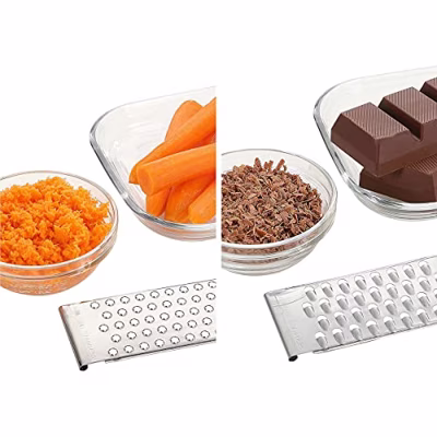 17,75 Universele rasp 4+1 van Leifheit voor alles wat in de keuken gesneden, geraspt of geschaafd moet worden. Klaart ieder klusje snel en met een perfect resultaat. Zelfs tomaten kun je moeiteloos snijden, dankzij het V-inzetstuk. Dankzij de schuine snijkanten van het mes ondervindt het minder weerstand van het vel bij het doorsnijden van tomaten, waardoor je exact gesneden, even grote plakjes krijgt. Naast een tomatenmes heeft dit multitalent ook een grove en een fijne groenterasp, een aardappelrasp en een in hoogte verstelbaar mes. Door middel van een kleine hendel kunnen de messen versteld worden, zodat je groente en fruit naar wens in dunne of dikke plakjes kunt snijden. De inzetstukken kun je aan de zijkant in de rasp schuiven. Zo berg je ze plaatsbesparend op en raken ze niet kwijt. Houder voor veilig snijden tot op het laatste plakje. Alle inzetstukken zijn van rvs en dus vaatwasserbestendig.