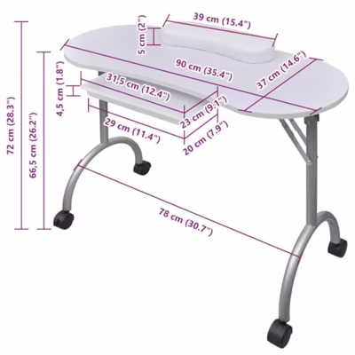 Deze inklapbare manicuretafel met dik polskussen is geschikt voor professionals en particulieren. Het dikke polskussen is bekleed met kunstleer en houdt tijdens de manicure de hand in een comfortabele positie. Het grote tafelblad heeft voldoende ruimte om alle manicurespullen te plaatsen. In de ingebouwde lade kan je kleine manicure-instrumenten, zoals een nagelschaar, nagellak en nagelvijlen, opbergen. De 4 vergrendelbare wielen zijn ontworpen om mobiliteit en eenvoudige plaatsing te garanderen. Dankzij de massief stalen poten is onze nageltafel zeer duurzaam. Hij is eenvoudig in te klappen om ruimte te besparen. De levering bevat ook een zwarte draagtas, waardoor de tafel eenvoudig kan worden meegenomen.