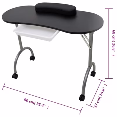 Deze inklapbare manicuretafel met dik polskussen is geschikt voor professionals en particulieren. Het dikke polskussen is bekleed met kunstleer en houdt tijdens de manicure de hand in een comfortabele positie. Het grote tafelblad heeft voldoende ruimte om alle manicurespullen te plaatsen. In de ingebouwde lade kan je kleine manicure-instrumenten, zoals een nagelschaar, nagellak en nagelvijlen, opbergen. De 4 vergrendelbare wielen zijn ontworpen om mobiliteit en eenvoudige plaatsing te garanderen. Dankzij de massief stalen poten is onze nageltafel zeer duurzaam. Hij is eenvoudig in te klappen om ruimte te besparen. De levering bevat ook een zwarte draagtas, waardoor de tafel eenvoudig kan worden meegenomen.