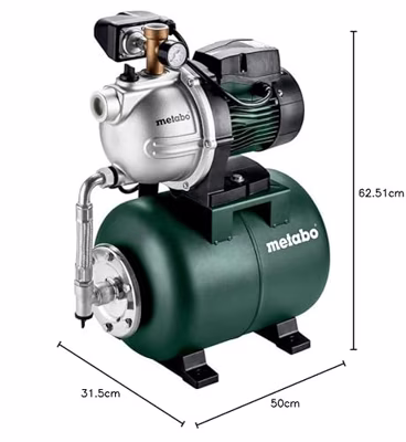 Bijzondere kenmerken * Voor de automatische watervoorziening, voor de tuinirrigatie, het grondwatertransport alsook voor het transporteren, oppompen en circuleren van schoon water * Drukketel voor energiebesparend en geluidsarm leveren van water * Drukschakelaar op de pompkop voor automatische activering bij groter waterverbruik * Onderhoudsvrije condensatormotor * Overbelastingsbeveiliging: beschermt de motor tegen oververhitting * Hoogwaardig glijringafdichtingssysteem voor lange levensduur * Aparte watervulopening voor eenvoudige ingebruikname van de pomp * Gereedschapsloze wateraftapplug ter bescherming bij vorstgevaar * Voor de tuinirrigatie met 1 of 2 sproeiers * Voor eenfase wisselstroom Technische gegevens * Opgenomen vermogen900 W * Max. opvoercapaciteit3500 l/h * Max. opvoerhoogte45 m * Max. druk4.5 bar * Max. aanzuighoogte8 m * Inschakeldruk ca.1.4 bar * Uitschakeldruk ca.3.2 bar * Zuigaansluiting1" inwendige schroefdraad *