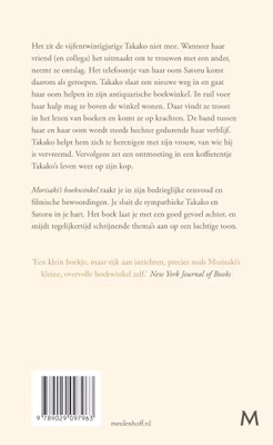 Morisaki's boekwinkel raakt je in zijn bedrieglijke eenvoud en filmische bewoordingen. Je sluit de sympathieke Takako en Satoru in je hart. Het boek laat je met een goed gevoel achter, en snijdt tegelijkertijd schrijnende thema's aan op een luchtige toon.
