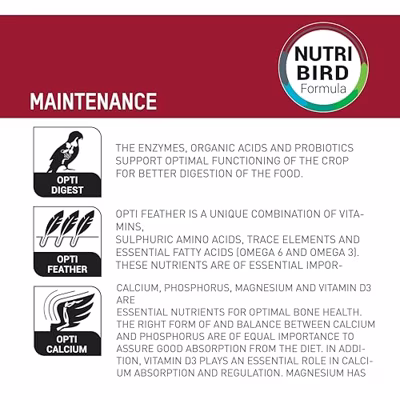 Nutribird P15 Original 1 kgNutriBird P 15 Original is een uitgebalanceerd volledig onderhoudsvoeder voor papegaaien. Geëxtrudeerde pellets met een wetenschappelijk verantwoorde samenstelling, op basis van geselecteerde granen, verse vruchten en aardnoten. Volledig opneembaar, geen verlies. Zorgt voor een gezonde spijsvertering en darmflora, een prachtig verenpak en een sterk skelet door de optimale calcium-fosfor verhouding. Indien uw vogel niet gewoon is aan korrelvoeding, moet de omschakeling naar dit nieuwe voeder geleidelijk gebeuren.Samenstelling: granen, noten (gepelde aardnoten 10%), plantaardige bijproducten, groenten, mineralen, oliën en vetten, zaden (3%), vruchten (appel 5%*), suikers, MOS, yucca*gedehydreerd fruit & groenten, % equivalent voor drogenAnalytische bestanddelen: eiwit 15%, vetgehalte 16%, ruwe celstof 2,5%, ruw als 7%, calcium 0,9%, fosfor 0,6%, methionine 0,35%, lysine 0,8%, threonine 0,5%, tryptofaan 0,15%, cystine 0,25% Toevoegingsmiddelen: vitamine A 8000 IE, vitamine D3 1650 IE, β-caroteen 4,8 mg, vitamine E 95 mg, vitamine B1 8 mg, vitamine B2 17,5 mg, calcium-D-pantothenaat 22 mg, vitamine B6 6,5 mg, vitamine B12 0,03 mg, vitamine C 55 mg, niacine 90 mg, foliumzuur 1.65 mg, biotine 0.29 mg, cholinechloride 770 mg, 3b202 (jodium) 2.3 mg, 3b405 (koper) 11 mg, 3b503 ( mangaan) 110 mg, 3b605 (zink) 105 mg, 3b802 ( selenium) 0,11 mg, 3b811 (organisch selenium) 0,11 mgGebruiksaanwijzing: Vrij te verstrekken.Inhoud: 1 kg