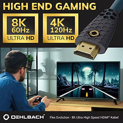 De Oehlbach FLEX EVOLUTION UHD HDMI 1,5M is een HDMI-kabel die je hoge kwaliteit kan bieden! De kabel heeft een lengte van 1,5 meter, daarmee kan je apparaten eenvoudig koppelen zonder complexe constructies.Voordelen van de Oehlbach FLEX EVOLUTION UHD HDMI 1,5M * Hoogwaardige OFC-geleider * 8K 60 Hz en 4K 120 Hz * KnikbeveiligingOehlbach FLEX EVOLUTION UHD: hoge kwaliteit en super snelle prestatiesDe Flex Evolution Ultra High-Speed HDMI-kabel biedt een verbluffende kwaliteit in 8K bij 50/60 Hz of 4K bij maximaal 120 Hz. Het heeft een speciaal ontwikkelde, geregistreerde patentplug met geïntegreerde knikbeveiliging. De constructie en de materiaaleigenschappen van deze stekker zorgen voor een optimale bescherming van de kabel tegen kabelbreuk, terwijl tegelijkertijd de stekkerbehuizing wordt ingekort. De kabel is PVC-vrij en gebruikt alleen TPE (thermoplastisch rubber). Een hoogwaardige OFC-geleider, drievoudige afscherming en 24-karaats vergulde stekkers zorgen voor de