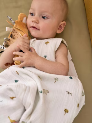 Een omkeerbare trappelzak voor een zachte zomer!Het heeft een doorlopende ritssluiting in het midden voor snel en gemakkelijk aantrekken! Mouwloze zomertrappelzak zonder vulling Omkeerbare slaapzak Centrale ritssluiting over de hele lengte 1 kant bedrukt met dieren van de savanne 1 gestreepte kant Maten Leeftijd / Lengte van baby:0-6 maanden / 50-67 cm6-18 maanden / 67-81 cm18-36 maanden / 81-97 cm Meer informatie Het gebruik van de trappelzak wordt aanbevolen tot 24 maanden, in een maat die aangepast is aan die van de baby. TOG = 1. Ontdek hier hoe je de juiste TOG kiest met onze aanbevelingen voor de temperatuur. LET OP! Niet gebruiken als het kind kan staan en uit het bedje kan klimmen LET OP! Niet gebruiken in combinatie met ander beddengoed Samenstelling: beide kanten van katoengaas 100% katoen