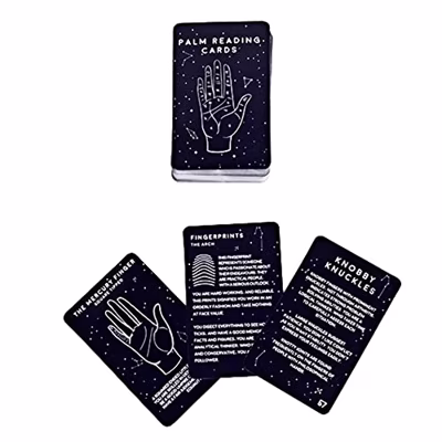 Palm reading kaarten van Gift Republic. Set van honderd kaarten waarmee de de handpalm van jezelf of anderen kunt lezen. Je leert o.a. over vingerafdrukken en de lijnen in je handpalm. Grappig cadeau voor iedereen die wel eens naar een handlezer zou willen gaan. De teksten zijn geschreven in het Engels.