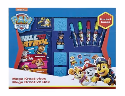 Paw Patrol Mega Creatieve SetMaak de mooiste Paw Patrol kunstwerken met deze extra grote en complete Paw Patrol teken en stempelset inclusief tekenboekje, 5 viltstiften, 1 stickervel, 4 stempels en stempelkussen. Een grote set met alles wat je nodig hebt om te tekenen en stempelen.
