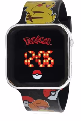 Pokémon LED horloge waarop de tijd in duidelijke rode cijfers wordt weergegeven. Met afbeeldingen van Bulbasaur, Squirtle, Charmander en Pikachu op het bandje. Geschikt voor kinderen vanaf 3 jaar.