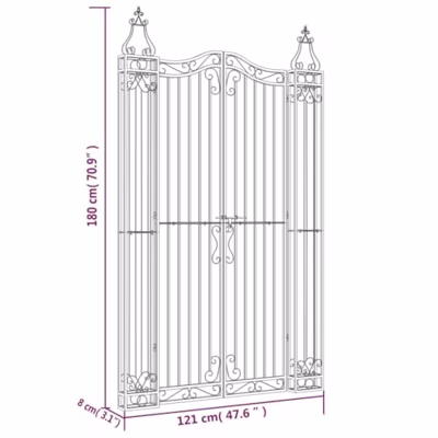 Deze sierlijke poort met elegante palen is een ideale entree voor de schutting rondom je tuin of terras. Duurzaam materiaal: de metalen tuinpoort is gemaakt van smeedijzer en is gepoedercoat, waardoor hij duurzaam is. Smeedijzer is een ijzersoort die hard, sterk, en corrosiebestendig is, waardoor het perfect is voor buitentoepassingen.Afsluitbaar systeem: de smeedijzeren poort heeft een scharniergrendel voor het slot om de veiligheid te vergroten.Paalontwerp: de smeedijzeren palen bieden een sterk ondersteuningssysteem voor de poort en zijn een mooie aanvulling op je erf of tuin.Elegante uitstraling: elegante vormen en decoratieve accenten maken de poort tot een optisch hoogtepunt in je tuin.