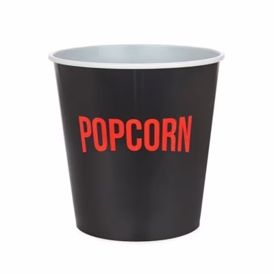 Popcorn emmer van Balvi. Zwarte popcorn bak met in het rood de tekst popcorn. Voor mensen die liever films en series streamen dan echt naar de bios gaan, maar alsnog willen genieten van popcorn erbij. Handige popcorn emmer met een inhoud van 2,8 liter, om je filmavond compleet te maken. Afmeting: 18 x 17,5 x 17,5 centimeter.
