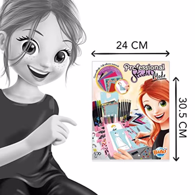 Kies een silhouet, teken de outfits met de sjablonen en geef ze volume dankzij de vele meegeleverde accessoires: zelfklevende stof, veren, glitter, viltstiften, linten, aquarelpotloden, scharen, potloodslijper ... Laat je inspireren door het portfolio om je eigen trends te creëren! Professionele Studio Mode BUKI omvat : Inclusief zelfklevende stofcoupons Aquarelpotloden en viltstiften met dubbele punt Talrijke decoratieve accessoires Een houder met 4 sjablonen 30 bedrukte silhouetten 6 dubbelzijdige viltstiften 6 aquarelpotloden 1 zwarte stift Een schaar, een potloodslijper Draad en lint Miniknopen en strass-steentjes Veren en glitter 5 vellen zelfklevend vilt 3 vellen zelfklevend glitterpapier 9 zelfklevende stofcoupons Geïllustreerde handleiding in kleur MEER INFORMATIE: Een creatieve en speelse doos om te leren hoe je je eigen modellen kunt creëren en de modewereld kunt ontdekken Vanaf 7 jaar