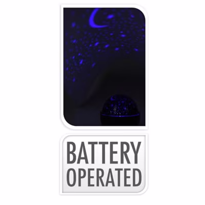 Sterren projectielamp met blauw licht. De lamp is 16 x 16 x 12,5 centimeter groot en werkt op batterijen.