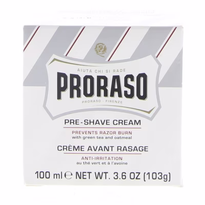 Proraso Pre & Ash Balsem Creme Met Groene Thee Sensitive Skin 100ml is een pre-shaving crème speciaal voor de gevoelige huid. Deze crème is verrijkt met havermoutextract en groene thee om de baard te verzachten en de huid te beschermen tijdens het scheren. Dankzij de crème glijdt het scheermes makkelijker over de baard en de huid, waardoor irritaties worden voorkomen. Voor een aangenamer, sneller en gemakkelijker scheren zonder de gevoelige huid te beschadigen.Gebruik: maak het gezicht vochtig en breng daarna de Pre-Shaving Cream aan. Masseer met ronddraaiende bewegingen, scheer vervolgens de baard met zeep of scheerschuim.Plus- en minpuntenGeschikt voor de gevoelige huidBevat aloë vera, groene thee en vitamine E Pre-shaving crème