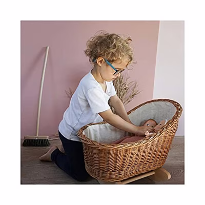 Rieten Poppenschommelwieg Emma Les Petits Deze klassieke schommelwieg van Egmont Toys is een echt pareltje. De binnenkant van het wiegje en het kussentje zijn bekleed met ecru katoenen stof. Ook voorzien van een gebreid dekentje in de kleur oud roze. De wieg is heel mooi afgewerkt en, zoals bij elk rieten meubelstuk, dient ook als versiering. Afmetingen: ca. 50 x 35 x 40 Een poppenwagen die erbij past? Bekijk de Rieten poppenwagen Emma Les Petits ! Of maak een leuk setje met de Rieten draagmand Emma Les Petits