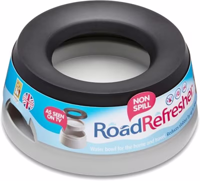 De Road Refresher is een slim ontworpen waterbak die dankzij een speciale constructie zorgt dat er minder water gemorst wordt. Ideaal voor in de auto, caravan of op de boot. De waterbak heeft klittenband aan de onderzijde en de bijgeleverde antislip strips zorgen ervoor dat de waterbak vast en stevig blijft staan op iedere vloer. Aan de bovenzijde zit, door middel van een clicksysteem, een ring die het opslaande water tegenhoudt. De waterbak blijft op zijn plek en de vloer blijft droog, zelfs als er per ongeluk tegenaan gestoten wordt. Tevens zorgt dit slimme ontwerp er voor dat lange oren en baarden van de hond uit het water blijven.