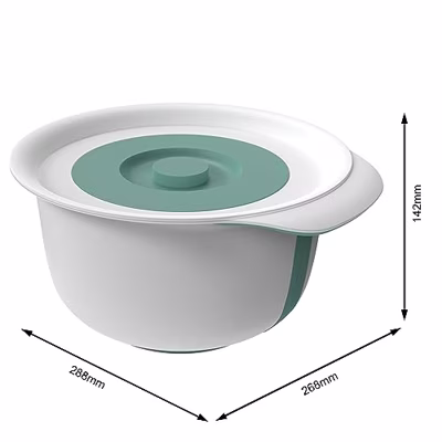 Deze praktische set combineert alles wat je nodig hebt om te bakken: twee hoogwaardige mengkommen in verschillende maten, een tweedelig deksel met spatbescherming, een comfortabele handgreep en een voet die niet wegglijdt op het werkblad. De kommen zijn daarom bijzonder geschikt om te roeren en te mixen en zijn een populaire hulp bij het bakken en koken. Stevige kom met antislipvoet Dankzij de ergonomische handgreep ligt de kom comfortabel in de hand en zorgt voor comfortabel werken. De antislipring op de vloer zorgt ervoor dat je ook bij het werken met de mixer stevig staat en dankzij de spatbeschermingsring ontstaan ??er geen vlekken op het werkblad. In de aparte kleine kom kunnen ingrediënten bijvoorbeeld apart worden afgewogen. Dankzij het deksel is de kom ook perfect voor het bewaren van voedsel.