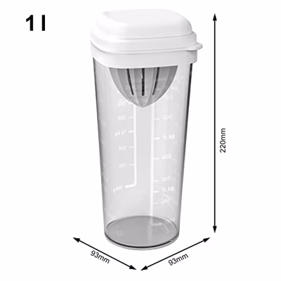 Rotho LOFT shaker met citruspersSchudden, meten, mengen of persen - alles is gemakkelijk met deze shaker. Het heeft verschillende schalen voor het meten van verschillende dingen, zoals water, meel, rijst en suiker. Het is de perfecte maat om direct in de shaker te mengen met een staafmixer. Tegelijkertijd past hij ideaal in het zijvak van de koelkast om sauzen, sappen en nog veel meer koel en veilig te houden. Dankzij de citruspers kunnen heerlijke vruchtensappen direct in het kopje worden bereid. Met het blenderhulpstuk kunnen vloeistoffen heerlijk romig worden geschud.Inhoud: 1 literKleur: wit/transparant