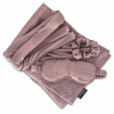 Ontdek de luxe van de Sleeptime Beauty SetErvaar de ultieme slaapervaring met de Sleeptime Beauty Set 4-delig. Deze zorgvuldig samengestelde bundel biedt de perfecte combinatie van luxe en comfort voor een ontspannen nachtrust. Of je nu je haar wilt beschermen, je huid wilt verzorgen of gewoon wilt genieten van een comfortabele slaap, deze set heeft alles wat je nodig hebt. De voordelen van slapen op satijnSatijn staat bekend om zijn zachte en gladde textuur, die niet alleen heerlijk aanvoelt, maar ook tal van voordelen biedt voor je haar en huid. De gladde textuur vermindert wrijving, wat helpt om haarbreuk en pluis te voorkomen. Bovendien zorgt satijn ervoor dat je huid minder ruw over het kussen wrijft, wat bijdraagt aan het verminderen van rimpels en fijne lijntjes.Bescherm je haar en huid tijdens de nachtDe Sleeptime Beauty Set bevat vier essentiële items die speciaal zijn ontworpen om je haar en huid te beschermen terwijl je slaapt. De satijnen kussensloop zorgt ervoor dat je haar 's nachts niet pluist en voorkomt het ontstaan van slaaprimpels. Het satijnen oogmasker biedt een zachte, comfortabele pasvorm en helpt bij het verminderen van oogrimpels. De satijnen scrunchie houdt je haar op zijn plaats zonder het te beschadigen, ideaal voor elk haartype.Prachtige krullen zonder hitteEen uniek onderdeel van deze set is de satijnen heatless curler, waarmee je je haar kunt krullen zonder hitte. Deze tool gebruik je eenvoudig door nat of vochtig haar om de curler te wikkelen en vast te zetten met de bijgeleverde satijnen scrunchie. Laat het drogen terwijl je slaapt, en je wordt wakker met prachtige, gladde krullen zonder enige schade aan je haar.Kwaliteit en duurzaamheidDeze set is gemaakt van hoogwaardige materialen, bestaande uit 95% polyester en 5% spandex, met een glanzende satijnen afwerking. Daarnaast is de set behandeld met anti-bacteriële zilverionen voor extra hygiëne en is ethisch geproduceerd met Oeko-Tex®-certificering. Uiteraard is de set niet op dieren getest, wat bijdraagt aan een verantwoordelijke en duurzame keuze. Wat zit er in de Sleeptime Beauty Set? Satijnen kussensloop * Afmeting: 60 x 70 cm * Voorzien van een verborgen rits Satijnen scrunchie * Geschikt voor alle haartypes * Comfortabele pasvorm zonder schade Satijnen oogmasker * Helpt tegen oogrimpels * Geschikt voor elke pasvorm Satijnen heatless curler * Krult je haar zonder hitte * Te gebruiken met nat of vochtig haar