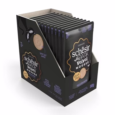 Schesir after Dark Velvet mousse kip en eend 80gDeze zachte en fluweelachtige mousse biedt een hoogwaardige eiwitbron voor uw kat, met een basis van echte kipfilets en verrijkt met smakelijke stukjes hart, lever, maagjes en heerlijke eend. Het recept is 100% compleet en uitgebalanceerd, wat betekent dat het alle essentiële eiwitten, vitaminen en mineralen biedt die uw kat nodig heeft. De mousse-textuur maakt het gemakkelijk voor uw kat om te eten, terwijl de hoge vochtigheid bijdraagt aan de benodigde hydratatie. Dit product is graanvrij en gemaakt van minimaal bewerkte, hoogwaardige ingrediënten, wat bijdraagt aan de voedingswaarde en de gezondheid van uw kat.Ingrediënten: Kip 61% (waarvan 5% maagjes, 5% lever, 5% hart) Kipbouillon 26% Eend 6% Geraffineerde zonnebloemolie Tapiocazetmeel Eipoeder MineralenAnalytische Componenten: Eiwit: 11% Ruw vet: 5% Ruwe as: 2% Ruwe vezels: 0,5% Vocht: 80% Calcium: 0,23% Fosfor: 0,20%Advies over gebruik:De aanbevolen hoeveelheden zijn bedoeld voor de toediening van de mousse alleen en kunnen variëren op basis van de specifieke behoeften van uw kat, zoals gewicht, leeftijd en levensstijl. De aanbevolen dagelijkse porties zijn: Voor een kat van 4 kg: 3 porties Voor een kat van 6 kg: 4 porties Voor een kat van 8 kg: 5 portiesBewaring:Serveer de mousse op kamertemperatuur. Bewaar het in de koelkast na opening en gebruik binnen 48 uur om de versheid en kwaliteit te behouden.