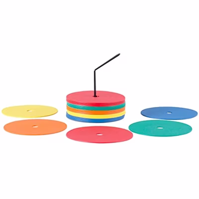Set consisting of a stand and 25 non-slip circles for marking out training areas. Consists of 5 units of each colour of rubber (blue, yellow, orange, white and red). No logo. Circle diameter: 15 cm.