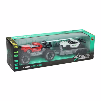 Set van drie kunststof frictievoertuigen, bestaande uit twee auto's en een afneembare aanhanger. Rijden vanzelf door na een duw. Geschikt voor kinderen vanaf 3 jaar.