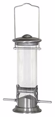 Geschikt voor zaadmengsels en zonnebloem-kernen voor het voeren van wilde vogels van aluminium, zware uitvoering met breukbestendige kunststof buis met ophangvoorziening grote opening...
