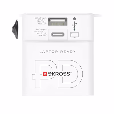 Met de World adapter MUV USB AC65PD van Skross ® kunnen reizigers wereldwijd zowel een USB-C-apparaat als een gewoon USB-apparaat opladen en tegelijkertijd een ongeerdeerd 2-polig apparaat aansluiten....