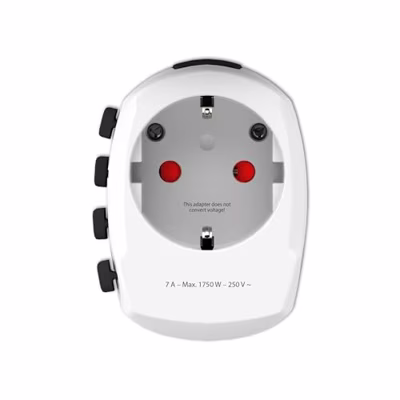 De krachtigste 3-polige wereldreisadapter voor reizigers uit EuropaDe uitzonderlijke reisadapter PRO zorgt voor een eenvoudige en veilige aansluiting van 2- en 3-polige apparaten uit Europa (Schuko & Euro) op meer dan 120 bestemmingen.Kan tot 1750 W aan vermogen aan, zodat u zelfs krachtige apparaten zoals laptops of reisföhns kunt aansluiten.Dit is de veiligste manier om apparaten over de hele wereld aan te sluiten.• Ontworpen in Zwitserland• Geschikt voor apparatuur met geaarde & ongeaarde stekkers (2- & 3-polig)• Ingangsstekkers: Europa (Schuko & 2-polige Euro)• Uitgangsstekkers: Australië/China, VK, VS, Zwitserland, Italië, Brazilië• Ingangsspanning: 100 V – 250 V• Maximaal. belasting: 7 A• Vermogen: b.v. 100 V – 700 W / 250 V – 1750 W• Vervangbare zekering: T 7 A• Converteert geen spanningIngangsvoltage: 100 - 250 V ACKleur: WitMaximale stroomverbruik: 1750 WPrimair land (afkorting): EUStekkertype: Australia / Type I, Italy / Type L, Switzerland / Type J, UK / Type G, USA / Type-AStroom: 7 AType stopcontact: F (CEE 7/3)Type stroombron: NetvoedingUSB Connectie: NeeZekering: JaGewicht: 141 g