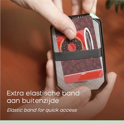 Met z'n compacte formaat zou je bijna denken dat er amper iets in past, maar niets is minder waar. Je stopt er met gemak meerdere pasjes in én er is een apart vakje voor briefgeld. Aan de buitenkant zit een elastische band waar je bijvoorbeeld je visitekaartjes of snel contant geld achter kunt schuiven. Zo hou je alles geordend, overzichtelijk én binnen handbereik. Geen dikke leren portemonnee meer waar je halve leven in zit - alleen wat je écht nodig hebt, goed beschermd en supersnel toegankelijk.