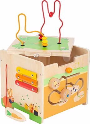 Met een kralendoolhof in de vorm van een konijn, vijf speelruimtes, een vorm-passend spel, een glijdend labyrint, een versnellingsspel en een xylofoon, is deze motorische kubus een echt multitalent als het gaat om spelen en ontdekken. Een hoogtepunt: de wortel, een vorm- en constructiespel in één, kan aan de zijkant worden geschroefd. Wanneer het deksel dat met een grendel is vastgezet, wordt verwijderd en ondersteboven in de kubus wordt opgeborgen, verandert dit speelgoed in een stevige kinderkruk! Jonge motoriekprofessionals worden bij het spelen met deze kubus begeleid door schattige babydieren en beleven samen met hen spannende avonturen in het thema van de boerderij. Dat bevordert hun nieuwsgierigheid en hun natuurlijke ontdekkingsdrang. Het is een uniek motorisch speelgoed met goed zichtbaar houtmateriaal dat de nieuwe favoriet in de kinderkamer zal worden!