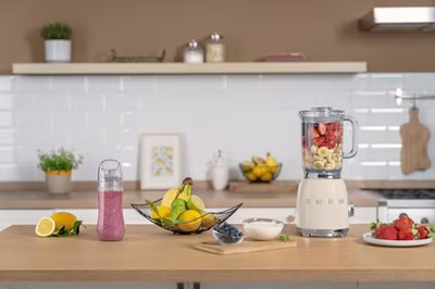 De Smeg BLF03CREU is een blender met een uniek retro design. Daardoor is het apparaat de eyecatcher van jouw keuken. De behuizing is gemaakt van gegoten aluminium en is daarmee van hoge kwaliteit.Voordelen van de Smeg BLF03CREU * Vermogen van 800 watt * Beschikt over 4 verschillende snelheden * Inclusief pulsfunctieGoede kwaliteit en uitstekende prestatiesVoor het maken van de lekkerste smoothies of sappen maak je gebruik van de modieuze blender van Smeg. Het apparaat heeft een behuizing van hoge kwaliteit. De prestaties binden er ook geen doekjes om. Met een vermogen van 800 watt worden etenswaren zeer goed en eenvoudig gemixt. Tijdens het mixen heb je de keuze uit 4 verschillende snelheden en 4 verschillende programma's. De programma's (Smoothie, Groene Smoothie, Ice-Crush en Auto-Clean) zijn vooraf ingesteld. Voor optimaal resultaat beschikt de blender ook nog over de handige pulsefunctie.