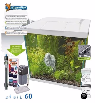 De SuperFish Start 60 Aquarium Set biedt een compleet 54-liter aquarium met een helder Retro LED-verlichtingssysteem. Ideaal voor beginners, het wordt geleverd met een interne filter en essentiële accessoires voor een gezonde en levendige onderwaterwereld. Perfect voor elke ruimte, voeg eenvoudig water en vissen toe voor een direct effect. Transformeer je kamer met dit compacte en stijlvolle aquarium.Warentuin heeft alles voor huis, tuin, dier & kerst! Start 60 qube kit wit SuperFish - Superfish, dit komt uit het assortiment Aquariums & Toebehoren, koop hem gemakkelijk en goedkoop online! Dit product verkopen wij per stuk tenzij anders aangegeven.