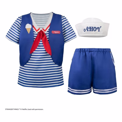 Embark on a journey to the '80s with our Scoops Ahoy Robin costume, inspired by the witty character from the iconic series Stranger Things. The costume features the iconic Scoops Ahoy shorts and stripy blue and white top adorned with a red and white sailor collar. The ensemble is completed with the Scoops Ahoy vest featuring Robin's red name tag, along with the essential Ahoy sailor hat to top it all off.For the ultimate Stranger Things experience, consider pairing the Scoops Ahoy Robin costume with our Scoops Ahoy Steve ensemble. Together, these costumes create a dynamic duo that will surely turn heads at any event or party.- Available in two sizes- 100% polyester- 4 pieces included