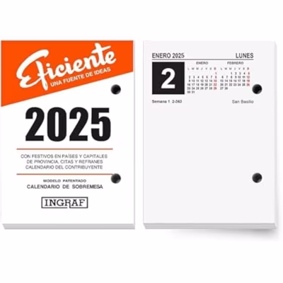 Ga terug naar kantoor zonder iets te vergeten! Koop Tafelkalender Ingraf 8,2 x 11,6 cm 2025 en uw collega's zullen jaloers zijn!Jaar: 2025Soort:OrganizerTafelkalenderKalenderKleur: WitTaal: SpaansGewicht: 70 g/m²Afmetingen ong.: 8,2 x 11,6 cmEAN: 8430173554116