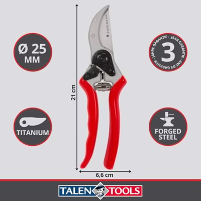 Deze professionele snoeischaar is geschikt voor het knippen van takken tot 25mm dik. De messen van de snoeischaar zijn gemaakt van Sk5 koolstofstaal van hoge kwaliteit wat zorgt voor een mooie rechte en scherpe snede. Het bovenmes is gepolijst waardoor de snoeischaar nog scherper wordt. De handvaten van de snoeischaar zijn gemaakt van gesmeed aluminium waardoor de snoeischaar sterker is dan snoeischaren die een gewoon aluminium handvat hebben. Over de handvaten zit een plastic anti-slip laagje wat voor een goede grip zorgt.