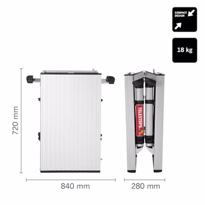Telesteps Solid Line Platform: Compact en Veelzijdig De Telesteps Solid Line Platform is een compact en verstelbaar werkbordes, ideaal voor diverse werkhoogtes tot wel 2,6 meter. Dankzij de telescopische functie is het platform perfect voor gebruik in smalle ruimtes. Het is ontworpen met een versterkt frame voor extra stabiliteit en torsiestijfheid, en is eenvoudig op te bergen en te vervoeren. Belangrijkste kenmerken van de Telesteps Solid Line Platform * Compact en verstelbaar - Geschikt voor verschillende werkhoogtes tot 2,6 meter. * Telescopische functie - Maakt gebruik in smalle ruimtes mogelijk. * Versterkt frame - Voor verbeterde stabiliteit en torsiestijfheid. * Gebruiksvriendelijke vergrendeling - Eenvoudig op te zetten en veilig in gebruik. * Ingebouwde handgreep - Voor gemakkelijk dragen en