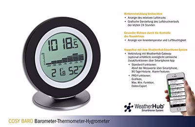 Artikelnummer: 4009816033932 Bekijk alles van TFA > Bekijk meer: Hygrometers > Barometer, thermometer en hygrometer in één Bespaar op gas of energie door de luchtvochtigheid in huis of kantoor in de gaten te houden. Bij een hoge luchtvochtigheid in huis of op kantoor kost het opwarmen van de ruimte namelijk meer energie dan wanneer deze laag is. Luchtvochtigheid kun je meten met hygrometers. Vervolgens weet je of je de ruimte beter moet ventileren of dat je juist de luchtvochtigheid moet verhogen. Deze factoren zijn van invloed op het luchtvochtigheidsgehalte in een ruimte: planten en huisdieren het aantal personen (vanwege ademen en transpireren) de mate van ventilatie het gebruik van luchtbevochtigers activiteiten waar water bij gebruikt wordt, zoals koken, douchen en dweilen Dit specifieke model werkt via het internet, geeft grafieken over de luchtdruk van de afgelopen 24 uur en kan verbinden met een smartphone app. Productspecificaties Barometer - Thermometer - Hygrometer - Cosy Baro Artikelomschrijving Barometer - Thermometer - Hygrometer - Cosy Baro Artikelnummer 4009816033932 Type Digitaal Type Meten = Weten Meetbereik temperatuur: -10°C tot 60°C Meetbereik luchtvochtigheid: 1% tot 99% Meetbereik luchtdruk: 913hPa tot 1113hPa Grafiek van de luchtdruk van de afgelopen 24 uren. Combinatie met WeatherHub gateway maakt vele optionele functies mogelijk via smartphone app (WeatherHub gateway niet inclusief) Batterijen niet inbegrepen