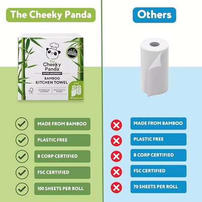 Artikelnummer: 5060561630042 Bekijk alles van The Cheeky Panda > Bekijk meer: Toilet- & Keukenpapier > FSC-gecertificeerd Bamboe Keukenpapier van The Cheeky Panda Het Cheeky Panda keukenpapier is een eco-vriendelijke keuze voor al je schoonmaakbehoeften. Gemaakt van 100% FSC-gecertificeerde bamboe, biedt dit keukenpapier een duurzaam alternatief met een uitstekende absorptiekracht. Met 2 lagen is het stevig en betrouwbaar voor het afvegen van oppervlakken. Deze verpakking bevat 2 rollen, zodat je altijd een reserve hebt. Kies voor The Cheeky Panda keukenpapier en geniet van een milieuvriendelijke en effectieve reinigingsoplossing in je keuken.  Productspecificaties Keukenpapier - FSC Bamboe - 2-Laags - 2st Artikelomschrijving Keukenpapier - FSC Bamboe - 2-Laags - 2st Artikelnummer 5060561630042 Land van herkomst China Hernieuwbaar - Gemaakt van 100% bamboe, de keukenrol van The Cheeky Panda is super duurzaam en volledig recyclebaar. Natuurlijk & huidvriendelijk - Geen chemische troep, alleen pure, plantaardige natuurlijke ingrediënten. The Cheeky Panda's keukenrol creëert minder weefselstof, dus is perfect voor de gevoelige huid. Sterk & absorberend - Perfect voor het schoonmaken van keukenvlekken en morsen Vriendelijk voor dieren - Gecertificeerd veganistisch en wreedheidsvrij! We hebben nooit op dieren getest en zullen dat ook nooit doen Bomen beschermen - Een deel van elke aankoop gaat naar de bescherming van planten en dieren in bedreigde regenwouden via The World land Trust. Milieu-informatie over Keukenpapier - FSC Bamboe - 2-Laags - 2st The Cheeky Panda gebruikt 100% FSC gecertificeerde bamboe. Bamboe is de snelst groeiende plant ter wereld. Het groeit 30 keer sneller dan de bescheiden bomen. The Cheeky Panda gebruikt niet het soort bamboe dat Panda's eten. In tegenstelling tot traditionele keukendoeken die uiteenvallen wanneer je ze het hardst nodig hebt, is bamboe gemaakt voor deze klus. Het is gemaakt van lange, sterke vezels die vriendelijk zijn voor je huid en bestand tegen troep zonder stukjes achter te laten. The Cheeky Panda is FSC, Vegan, Cruelty Free en B-Corp gecertificeerd.