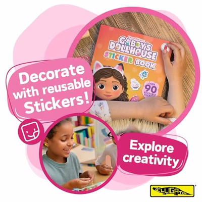 In dit leuke boekje van Gabbys Dollhouse combineer je twee leuke activiteiten, namelijk stickeren en kleuren. Maak de mooiste creaties met de zes dubbele paginas aan kleurplaten en laat daarna je fantasie de vrije loop met de ruim 90 stickers bijbehorende stickers. Plak de stickers op je kunstwerken, schoolschriften, uitnodigingen en nog veel meer. Dit alles in het thema van Gabby, Pandy Paws en alle andere kattenvriendjes! Naast de kleurplaten en stickers vind je op de achterkant van het boekje ook een leuk standaardje van DJ Catnip en Pillow Cat die je kunt uitknippen en neerzetten op je kamer, zo leuk! Stickerboek met meer dan 90 herbruikbare stickers van Gabby's Poppenhuis.