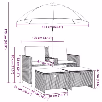 Deze tuinbank met parasol en voetenbanken is de perfecte aanvulling op je tuin of terras en biedt een comfortabele en uitnodigende ruimte om met familie en vrienden te kletsen of gewoon buiten te ontspannen en te genieten. Duurzaam materiaal: PE-rattan, ook wel poly rattan genoemd, is een sterke, onderhoudsarme kunststof die lijkt op natuurlijk rattan. Het is licht van gewicht en gemakkelijk schoon te maken en wordt vaak gebruikt voor tuinmeubelen vanwege de duurzaamheid en weerbestendige eigenschappen.Praktische parasol: de tuinbank heeft een parasol met een kantelmechanisme, waardoor je de luifel eenvoudig kunt verstellen voor optimale schaduw en bescherming tegen de zon.Afneembare en wasbare hoes: deze kussens hebben afneembare hoezen, waardoor ze eenvoudig te wassen en te onderhouden zijn.Compact op te bergen: de voetenbanken kunnen netjes onder de zittingen worden geschoven, waardoor ze ruimtebesparend kunnen worden opgeborgen.Robuust en stabiel frame: het gepoedercoat stalen frame zorgt ervoor dat het tuinmeubel sterk en stabiel is voor dagelijks buitengebruik. Goed om te weten:Om de levensduur van je tuinmeubelen te verlengen, raden wij je aan om de meubelen met een waterbestendige hoes af te dekken.