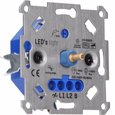 Deze dimmer is geschikt voor faseafsnijding- 2-draads systemen en heeft een inbouwhoogte/diepte van 25 mm. Het is ook compatibel met 2-draads systemen en 3-draads systemen. Met een maximaal vermogen van 250W is deze dimmer krachtig genoeg voor verschillende soorten verlichting.