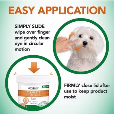 Vets Best Clean Eye Round Pads 100 stuksVets Best Clrean Eye Round Pads 100 stuks zijn handige reinigsingsdoekjes om de traansporen bij de ogen van de hond te verwijderen. Traanvlekken komen vaak voor bij honden met een witte vacht. Regelmatig gebruik van deze reinigingpads zal helpen om de verkleurde gedeeltes rondom het oog te verminderen. Haal simpelweg een pad uit de verpakking en gebruik deze om de vacht rondom de ogen te reinigen. Geen extra middelen nodig!- Speciale doekjes om op milde wijze traansporen bij de hond te verwijderen- Eenvoudig de traanvlekken van de vacht verwijderen- GebruiksklaarInhoud: 100 stuksEAN: 0031658803620