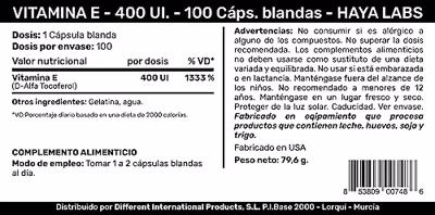 VITAMIN E 400IU van HAYA LABS is 100% natuurlijk en bevat 400IU Vitamine E per softgel. VITAMIN E 400IU HAYA LABS EIGENSCHAPPEN: Vitamine E heeft een Antioxidante werking. Het helpt met de bescherming tegen invloeden van vervuiling en zonlicht en helpt de cellen te beschermen tegen oxidatieve schade door luchtvervuiling. Vitamine E uit deze formule is significant sterker dan de Synthetische vorm. Vitamine E is olie oplosbaar en wordt moeilijk opgenomen. Vitamine E van Haya Labs bevat alle soorten Tocopherols; alpha beta, delta en gamma, voor een algehele werking. VITAMIN E 400IU HAYA LABS KENMERKEN: * Antioxidant * 400IU vitamine E per softgel * 67mg Mixed Tocopherols per softgel * 100 softgels