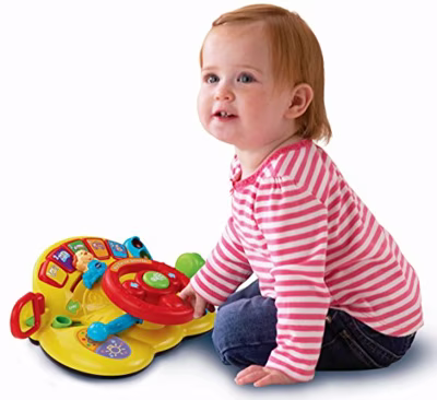 VTech Baby Mijn Eerste StuurtjeDraai het stuur en ga op avontuur! Dit stuurtje bevat drie speelstanden die kleintjes laten kennismaken met eenvoudige verkeersregels, dieren, voertuigen, cijfers, kleuren en nog veel meer! Druk op de toetsen en luister naar de grappige geluiden, vrolijke zinnetjes, gezongen liedjes en melodietjes. Het draaien van het stuur, het bewegen van de versnellingspook en het drukken op de claxon prikkelt de fantasie en zorgt voor volop speel? en rijplezier!Dit stuurtje bevat drie speelstanden die kleintjes laten kennismaken met eenvoudigeVerkeersregels, dieren, voertuigen, cijfers, kleuren en nog veel meerDruk op de toetsen en luister naar de grappige geluiden, vrolijke zinnetjes, gezongen liedjes en melodietjesHet draaien van het stuur, het bewegen van de versnellingspook en het drukken op de claxon prikkelt de fantasie en zorgt voor volop speel? en rijplezier10 melodietjes en 2 gezongen liedjesStevig en duurzaam designRegelbaar volumeAutomatische uitschakelingKenmerkenKleur van het product: Multi kleurenAanbevolen leeftijd (max): 3 jaarGeluid: JaOndersteunde talen: NederlandsMateriaal: KunststofVoorgemonteerd: JaCertificering: CEEnergieBatterijen vereist: JaType accu/batterij: AAOndersteund aantal accu's/batterijen: 2Overige specificatiesLeeftijd vanaf: 12 maand(en)Leer- & trainvaardighedenFijne motorische vaardigheden trainen: JaKleuren leren: JaTraining dagelijkse vaardigheden: JaRollenspel: JaGewicht en omvangGewicht: 770 gInhoud van de verpakkingBatterijen meegeleverd: Ja