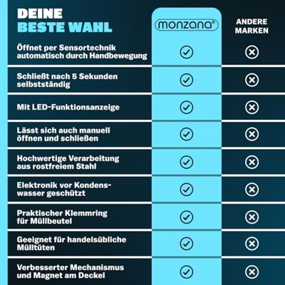 Slimme sensortechonologie:Deze vuilnisbak met sensor opent automatisch met één handbeweging en sluit het deksel meteen zelf nadat je je afval hebt weggegooid. Dankzij de waterdichte sensortechnologie met LED-display is de afvalbak met een inhoud van 58 liter ideaal voor in het huishouden, op kantoor of in je atelier. Comfortabel & hygiënisch:Is koken je passie of werk je graag aan DIY-projecten in je atelier? Dan vergemakkelijkt de afvalemmer met sensor al je werk. Zodra je dichterbij komt, opent het deksel automatisch en kan je je vuilnis op een schone en aangename manier weggooien. En ook wanneer de avond wat langer duurt, vind je de afvalemmer gemakkelijk dankzij het LED-scherm. Sluitingsmechanisme: Het deksel van de afvalbak sluit automatisch na 5 seconden. Dankzij zijn dempend sluitsysteem gebeurt dat op een stille en materiaalvriendelijke manier. Scharnieren van hoge kwaliteit, een stevige houder en magneten op het deksel zorgen bovendien voor een lange levensduur. Beschermende electronica:De binnenkant van de afvalbak is volledig gesloten zodat het batterijvak beschermd is tegen condensvorming. Voor een alternatieve stroomvoorziening zonder batterijen gebruik je een USB-kabel samen met een standaard USB-adapter voor het opladen van mobiele telefoons. Stijlvol & functioneel:Een stevige klemring houdt de afvalzak stevig op zijn plaats zodat de elegante look niet wordt verstoord door uitpuilende afvalzakken. Antislipring:De MONZANA® vuilnisbak met sensor is gemaakt van hoogwaardig, roestvrij staal. Een antislipring aan de onderkant zorgt voor een vaste grip op de grond, waardoor de vuilnisemmer een betrouwbaar hulpmiddel is voor dagelijks gebruik. Overtuigende extra's:De afvalemmer heeft een aan/uit-schakelaar, kan ook handmatig worden geopend en is geschikt voor standaard afvalzakken. Productvoordelen: opent automatisch met één handbeweging door de sensortechnologie sluit na 5 seconden automatisch met LED-functie en aan/uit-schakelaar kan ook handmatig worden geopend en gesloten Sluitingsmechanisme Binnenkant afgesloten Elektronica is beschermd tegen condensvorming afneembaar deksel praktische klemring voor vuilniszakken geschikt voor standaard afvalzakken verbeterde houder en magneet op het deksel speciale bescherming voor de scharnieren hoogwaardige afwerking uit roestvrij staal Antislipring aan de onderkant Inhoud: 58 liter met USB-kabel kan worden gebruikt met oplaadadapter Technische gegevens: Inhoud: 58 liter Afmetingen (hxbxd): 71 x 40 x 29 cm Materiaal buitenkant: roestvrij staal Materiaal deksel: ABS Batterijvoeding: 4 x AA 1,5 V (niet inbegrepen bij de levering) met sensortechnologie met aan/uit-schakelaar Afstand van de sensor: vanaf 25 cm Straal van de sensor: 60° Antislipring aan de onderkant Logo: MONZANA® in laserprint Kleur: Zwart Leveringsomvang: 1 x Vuilnisbak met sensor Handleiding