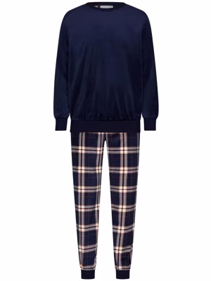 Een warme en duurzame velours heren pyjama van het merk Pastunette. Het nachtblauwe pyjamashirt heeft lange mouwen met boorden en een ronde hals. Ook de onderkant van het shirt is afgewerkt met een boord. De lange broek heeft een klassieke ruitenprint in de kleuren rood en wit op de nachtblauwe achtergrond. De broekspijpuiteinden zijn eveneens afgewerkt met boorden. De pyjama is gemaakt van gerecyclede materialen.