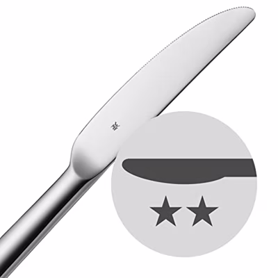 Maak van elk vleesgerecht een feestje met de WMF Nuova steakbestekset. Deze complete 12-delige set bevat zes geavanceerde steakmessen en zes bijpassende steakvorken, vervaardigd uit stevig Cromargan® roestvrijstaal 18/10. Het scherpe, gekartelde lemmet van de messen snijdt moeiteloos door biefstuk en kip, terwijl de vorken de perfecte ondersteuning bieden. Zowel messen als vorken hebben een slank, ergonomisch handvat voor optimale controle en comfort.