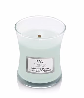 WoodWick geurkaars sagewood & seagrass mini candle is voorzien van een natuurlijk, houten lont waardoor het rustgevende geluid van een knisperend haardvuur een unieke sfeer creëert, terwijl jouw woonruimte gevuld wordt met een authentieke, natuurlijke geur.