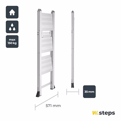 W.steps aluminum trap Vikingstep Maxi is een kleine, slimme en gemakkelijk te gebruiken aluminium opstap. Nuttig bij verschillende werkzaamheden en wanneer een klein beetje meer hoogte is vereist. Bijvoorbeeld thuis, in de winkel of in het magazijn.Bijzondere kenmerken * Stahoogte: 0.72m (720 mm) * Eenvoudig te dragen, gemakkelijk te vervoeren en op te bergen * Eenvoudig uit en in elkaar te vouwen * Slechts 35 mm in opgevouwen stand * De extra diepe treden van 210 mm maken de Wibe Vikingstep veilig en comfortabel in gebruik * Het aluminium is geanodiseerd om vlekken op handen of kleding te voorkomen * Afmetingen (LxBxH): 720x571x720mmTechnische gegevens * Merk: W.steps * Artikelnummer: WI728143 * Barcode: 7318127281435 * Serie: Base * Netto gewicht (kg): 7.0 * Materiaal: Aluminium * Gewicht (kg): 6.8 * Lengte (cm): 0.72 * Aantal stappen/niveaus: 3 * Met platform: Nee * Dubbele trap: Nee * Kleur: Zilver * Aantal treden: 3 treden * Stahoogte (m): 0.72